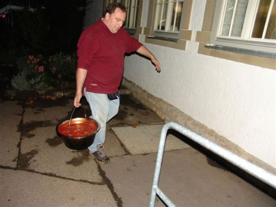 Backnang (kjl) – Wie jedes Jahr im Herbst bot der Vorplatz der Backnanger Stadthalle ein romantisches Bild: veranstaltete der Ortsverband der Landsmannschaft der Donauschwaben doch am 21. Oktober wieder sein traditionelles Fischgulaschessen. Wieder einmal brodelten die Gulaschkessel vor der Backnanger Stadthalle über dem offenen Feuer. Die Männer schwenkten die Kessel gefühlvoll, denn umgerührt werden darf sie auf keinen Fall, die nach traditionellem Rezept hergestellte Fischsuppe.