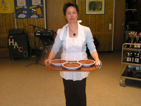 In der Stadthalle warteten die Gäste, bis die vielen Teller hereingetragen wurden. Das donauschwäbische Stammpublikum und alle weiteren Gäste, kosteten kritisch und fanden den Fischgulasch wieder ausgezeichnet.