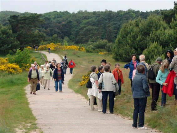 Am nächsten Tag stand die Besichtigung der autofreien Insel Hiddensee, ein Eiland von einzigartiger Lieblichkeit, auf unserem Programm. Mit einem Schiff wurden wir von Scharprode nach Kloster gebracht. Wir besichtigten dort die älteste Inselkirche und den Friedhof mit dem Grab des Dichters Gerhard Hauptmann. Entlang der Dorfstraße mit Einkaufsmöglichkeiten, einer Bernsteinschleiferei, einer alten Dorfbäckerei schlenderten wir vorbei am Haus von Gerhard Hauptmann (jetzt Museum) bis zur Ostsee, wo wir Steine sammeln konnten. An den Rändern wachsen weiß und pinkfarbig blühende wilde Heckenrosen. Wer wollte konnte dann an einer Wanderung zum Leuchtturm ins „Hochland“ von Hiddensee teilnehmen und die herrliche Vegetation betrachten. Die Hänge waren mit blühenden gelben Ginsterbüschen überzogen. Im Herbst leuchten dann die Früchte des Sanddorns, den man überall auf den Inseln findet. Mit dem Kremser ging es per Pferdewagen durch die blühenden Salzwiesen und den Beginn der Heide nach Vitte. Die MS „Vitte“ brachte uns nach Scharprode zurück. Am Abend wurde uns noch eine Boddenwanderung angeboten.