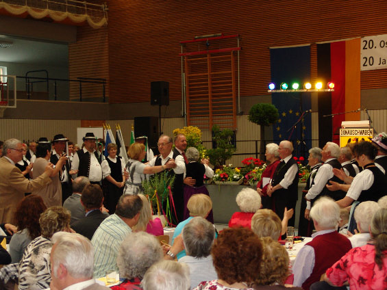 Nach dem Mittagessen im Bärenkeller ging es mit dem Bus zur Unstrut Halle nach Sömmerda. Ein buntes abwechslungsreiches Programm erfreute die zahlreich erschienenen Gäste in der festlich geschmückten Halle. Unter den Klängen des Prinz-Eugen-Marsches zogen alle Trachtenträger ein. Die Tanzgruppe Backnang eröffnete das Programm, Männerchor und Singkreis im Wechsel mit der Donauschwäbischen Tanzgruppe Mosbach und der Ungarndeutschen Tanzgruppe aus Babarc/Ungarn gestalteten den Nachmittag. Die Residenzstadtkapelle Gehren sorgte für die musikalische Unterhaltung.
