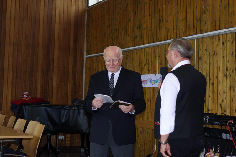 Richard Harle berichtete, dass er ihm gerade beim Zuhören kalt den Rücken runtergelaufen sei, denn auch er sei 8 Jahre alt gewesen, als sie das schöne Zuhause verlassen mussten. Diese Erlebnisse kommen immer wieder hoch und begleiten ein ganzes Leben lang. Bei den vorangegangenen Veranstaltungen habe er jeweils einen Gebrauchsgegenstand aus der alten Heimat mitgebracht. Dieses Mal stellte er den donauschwäbischen Dichter Jakob Wolf vor und trug das Gedicht „Unverlierbare Heimat“ aus dem Heft „Stoppelgang“ vor, das derzeit wieder sehr aktuell sei und in diesem Leid und Geschichte beschrieben werden, nicht nur Rückblick und Trauer sondern auch ein Ausblick ist enthalten. Es gibt keine Alternative zum Optimismus! Wir wollen uns nicht abkapseln sondern Traditionen pflegen und uns integrieren und uns gesellig zusammen setzen.
