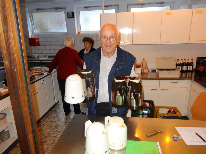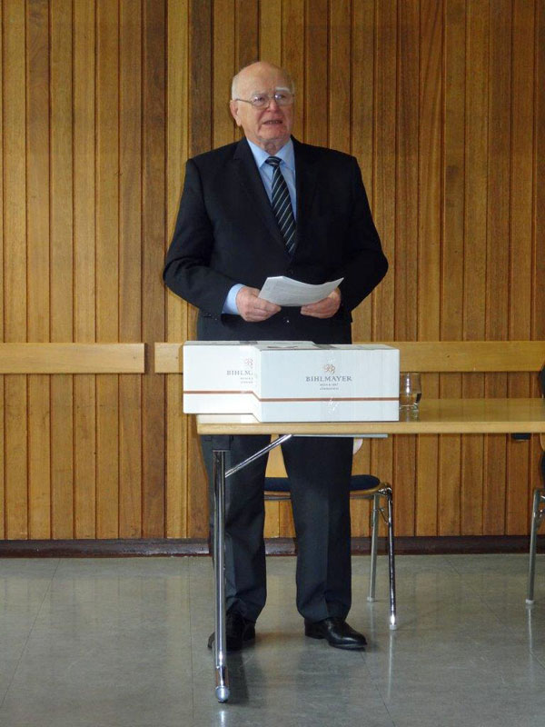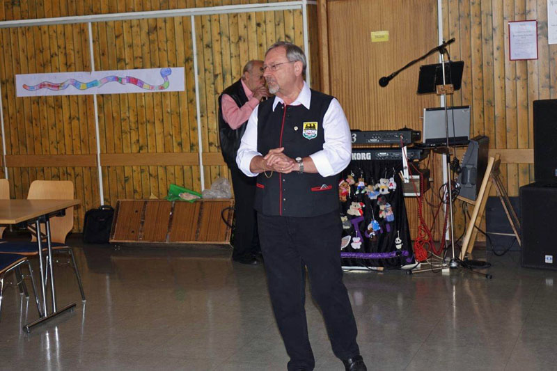 Verabschiedung von Josef Schall aus dem Vorstand Josef Schall gehörte dem Vorstand seit seinem Vereinsbeitritt 1964 an, das sind 52 Jahre. Zu seinen Aufgaben gehörte der wirtschaftliche Bereich, wie Wareneinkauf von Fleisch für Essen und Bratwurstmachen, Getränke, die Utensilien für den Kaffee und die Küche. Beim Bratwurstmachen war er zuständig für die Leitung der Gruppe und das Rezept der Wurstherstellung. Die Gewürzmischung wird er auch weiterhin vorbereiten. Wir wollen ihm für diese über 50-jährige Vorstandsarbeit unseren besten Dank aussprechen und mit diesem Dank auch ein Gebinde von 12 Flaschen eines ausgezeichneten Tropfen Weines überreichen.