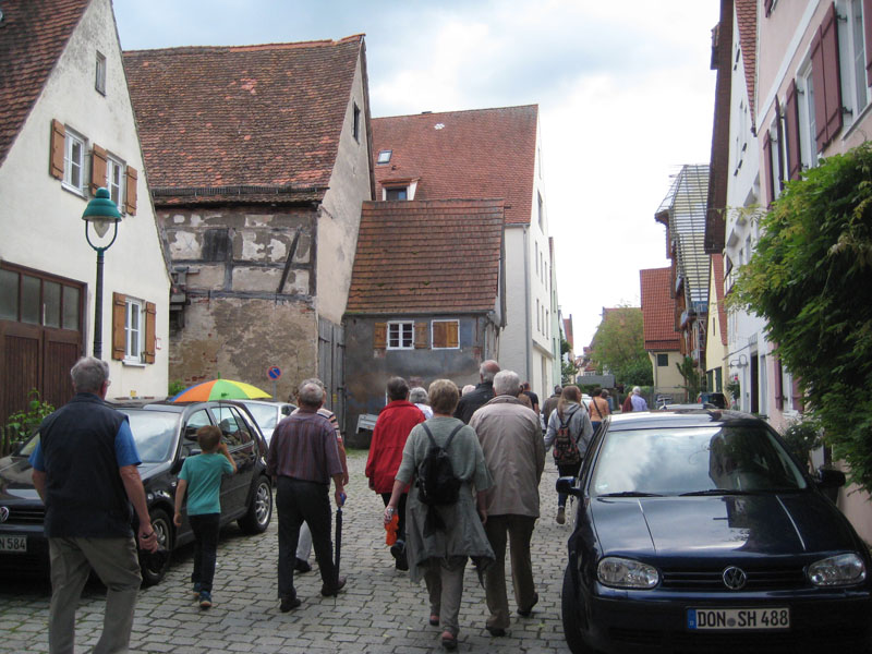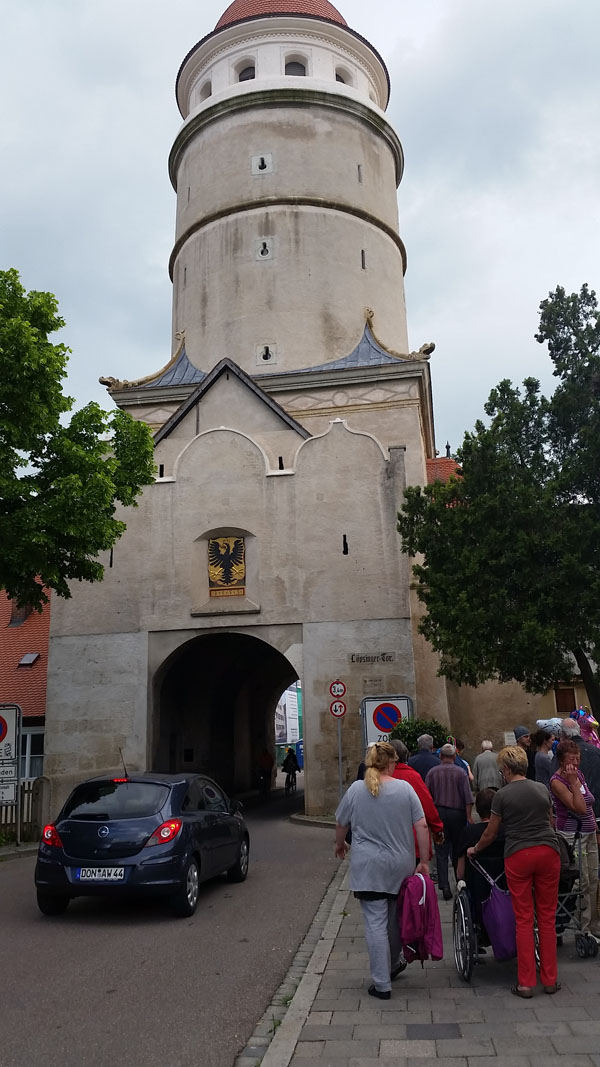 1215 erhielt Nördlingen von Kaiser Friedrich II. Stadtrechte und wurde Reichsstadt. In jenem Jahr wurde die erste Stadtmauer errichtet, deren Grundriss bis heute sichtbar ist. 1219 wurde die Nördlinger Pfingstmesse das erste Mal urkundlich erwähnt. Die Stadt, an der Kreuzung zweier großer Handelsstraßen (Frankfurt/Würzburg–Augsburg und Nürnberg–Ulm) gelegen, stieg zum wichtigen Handelsplatz für Getreide, Vieh, Textilien, Pelze und Metallwaren auf. Neben Frankfurt war Nördlingen eine der wichtigsten Fernhandelsmessen Deutschlands. Dies berichtete unsere Stadtführerin beim Betreten der Altstadt durch die Stadtmauer am Löpsinger Tor (eines von 5 Toren). Das Löpsinger Tor sicherte früher den Straßenzugang nach Nürnberg und Leipzig und beherbergt heute auf sechs Ebenen das Stadtmauermuseum. Unser Rundgang durch die historische Altstadt von Nördlingen führte uns vorbei an der gut erhaltenen Stadtmauer, liebevoll renovierten Gerberhäusern, dem Hafenmarkt, dem international bedeutsamen Rieskrater-Museum, der Spitalanlage und Spitalkirche, dem Kirchturm "Daniel", der St.-Georgs-Kirche, dem Rathaus, dem Leihhaus, dem Brot- und Tanzhaus. Nach einem erfrischenden Eis ging es wieder zurück zum Bus um die Heimreise nach Backnang anzutreten.