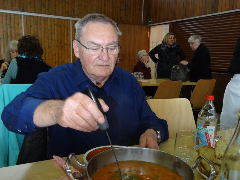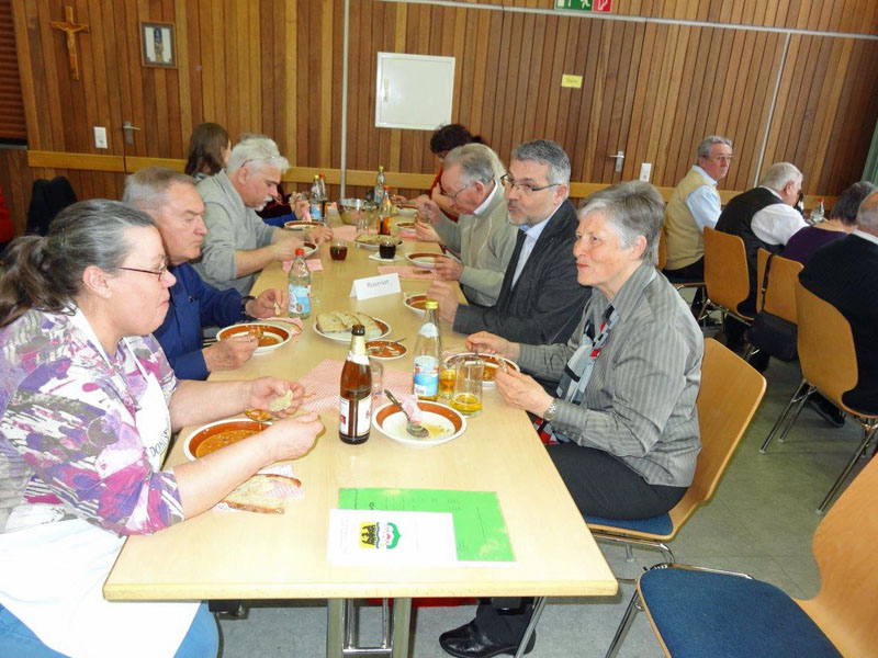 Der 1. Vorsitzende der Landsmannschaft der Donauschwaben Ortsverband Backnang, Heinz Kaldi, konnte gegen 12 Uhr am Sonntagmittag, 19. März, neben den Gästen, die zum Genuss der Bohnensuppe gekommen waren, auch Landsleute, die sich zum Treffen der Weprowatzer Heimatortsgemeinschaft eingefunden hatten, begrüßen. Einen besonderen Willkommensgruß richtete er an den Vertreter der Stadt Backnang, Herrn Ersten Bürgermeister Michael Balzer, und die Gemeinderäte Ingrid Beerkircher, Dr. Gerhard Ketterer und Sabine Kutteroff mit Partnern. Ebenso herzlich hieß er Richard Harle, den Kreisvorsitzenden der Donauschwaben, und den Hausherrn, Pfarrer Beck, willkommen.