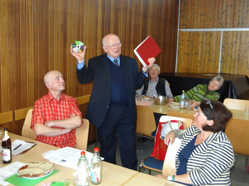 Der Kreisvorsitzende Richard Harle hatte schwere und extrem unterschiedliche Gegenstände dabei. Ein voller Magen studiert nicht gern und ein leerer Magen hört nicht zu. Jedoch nach dieser leckeren Bohnensuppe hoffe er auf gute Zuhörer. In der einen Hand hielt er ein großes dickes Buch mit den Namen von 56.000 Auswanderern, in der anderen Hand eine Diskette mit genau demselben Inhalt. Diese Diskette solle als Angelhaken für die junge Generation dienen, die wir für die Herkunftsforschung interessieren wollen. Wir dürfen nicht vergessen, wie man Bratwürste herstellt aber auch lernen, wie man mit dem Computer umgeht. Sonst sitzen wir zwischen zwei Stühlen. Er hatte zwei weitere dicke „Wälzer“ aus seinem Heimatdorf Rudolfsgnad mitgebracht. Einmal das „Familienbuch Deutsch Etschka, Sigmundsfeld, Rudolfsgnad“ und „Das Rudolfsgnader Kirchenbuch 1866 bis 1944“ und Disketten mit gleichem Inhalt. Diese Scheiben sind im Zweifelsfall unsere Zukunft. Warum sind diese Bücher nicht Vergangenheit sondern wichtig? Wenn die Jugend Interesse bekundet sollten die Älteren Antworten geben können. Damit wir Älteren dazu in der Lage sind waren wir verpflichtet solche Informationen zu sammeln. Er habe per Mail eine Anfrage eines jungen Nachkommen aus Rudolfgnad nach seinen Vorfahren erhalten und konnte anhand dieser Bücher seine Vorfahren und die Ansiedler benennen.
