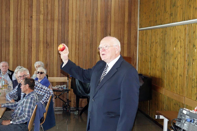 Der Kreisvorsitzende Richard Harle richtete zuerst Grußworte des Landesverbandes Baden-Württemberg aus, dann teilte er mit, dass er heute nicht mit leeren Händen gekommen sei, sondern einen ganz profanen Gegenstand mitgebracht habe, holte einen Apfel aus seiner Tasche und zeigte ihn in die Runde. Er vergleiche die Donauschwaben gerne mit einem Apfelbaum. Die Wurzeln des Baumes seien die Menschen, die Erstsiedler, die sich in der Zeit zwischen 1730 und 1790 in der pannonischen Tiefebene angesiedelt haben. Der Stamm sind die Familien die dort gelebt, gearbeitet und das Land urbar gemacht haben. Die Äste sind die Donauschwaben, die heute leben. Die Früchte - also die Äpfel - sind unsere Kinder.