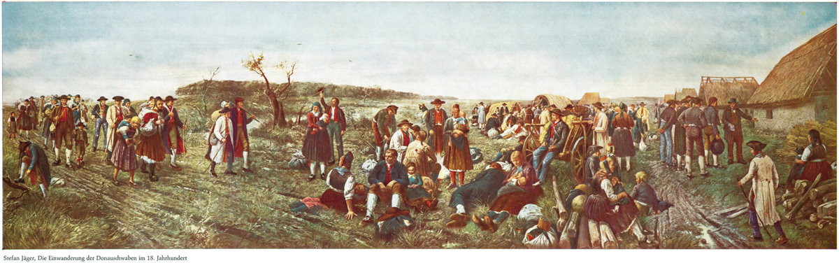 Nach der Befreiung Südosteuropas von der Türkenherrschaft standen die Habsburger Kaiser vor der Aufgabe, das heruntergekommene, verwahrloste und menschenleere Land wieder aufzubauen. In drei sogenannten "Schwabenzügen" während der Regierungszeit von Kaiser Karl (1722-1726), von Kaiserin Maria Theresia (1763-1771) und Kaiser Josef II (1782-1787) besiedelten deutsche Siedler die Hauptsiedlungslandschaften zu beiden Seiten der mittleren Donau in Ungarn, Jugoslawien und Rumänien (Südwestliches ungarisches Mittelgebirge, Schwäbische Türkei, Slawonien-Syrmien, Batschka, Banat und Sathmar).