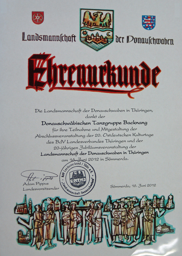 Die Donauschwaben aus Erfurt, deren Ortsverband erst nach der Wende gegründet werden konnte und der nächstes Jahr sein 20-jähriges Bestehen feiern kann, waren über die Darbietungen sehr erfreut, bedankten sich herzlich und luden die Donauschwäbische Tanz- und Trachtengruppe Backnang zu diesem Jubiläum nach Erfurt ein.