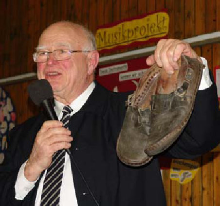 Nun übernahm Richard Harle mit seinem geheimnisvollen Beutel das Mikrophon. Es sei für ihn jedesmal eine Herausforderung, zu testen, wer von den Anwesenden noch alte Gegenstände aus der Heimat kennt. Das letzte Mal habe er einen „Ulaker“ dabei gehabt. Nun zeigte er seine Überraschung: Es war ein Paar „Batschger“, das robuste, tägliche Schuhwerk des donauschwäbischen Bauern auf dem Feld. Es handle sich um Original-Schuhe, die ihm für ein Museum zur Verfügung gestellt wurden. Ein indianisches Sprichwort sagt: „Derjenige kann die Sorgen eines Mannes erst verstehen, welcher drei Tage in seinen Schuhen gegangen ist.“ “Wir Donauschwaben dürfen nicht vergessen, wie man Bratwürste macht, aber auch nicht versäumen, mit dem Computer umzugehen. Essen hält Leib und Seele und uns Donauschwaben zusammen.“