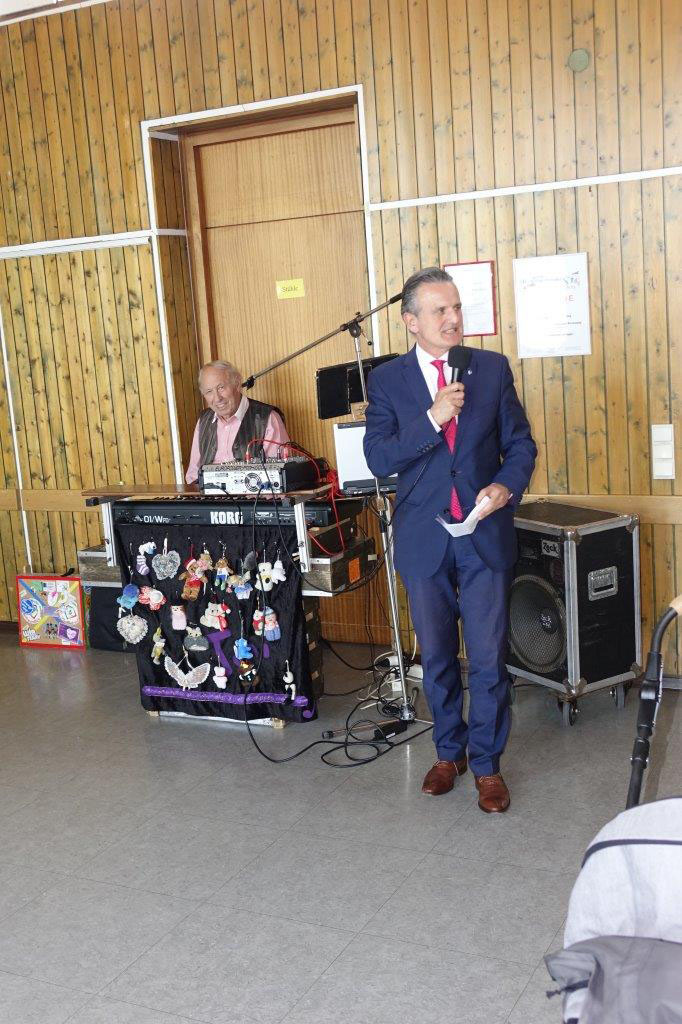 In seinem Grußwort bedankte sich Oberbürgermeister Dr. Nopper für die Einladung. Gulasch ist das Nationalgericht der Ungarn und der Donauschwaben. Es schmeckt den Donauschwaben und den einheimischen Gästen, denn das donauschwäbische Gulasch aus Backnang schmeckt am allerbesten. Nicht umsonst wird gesagt: „Nach einem guten Essen kann man allen Menschen verzeihen, sogar der eigenen Familie.“ Danach zitierte er das Gulaschlied: “Joi, mir ist sonst alles schnuppe, hab’ ich meine Gulasch-Suppe. Ungarnland, wie bist du dann so schön! Gulasch-Suppe brennt wie Feuer, Paprika ist ungeheuer scharf, die Tränen in den Augen steh’n. Wenn ich weine, wein’ ich nicht aus Leidenschaft, weinen muss ich nur von diesem Zwiebelsaft.“